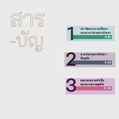 สาร ประวััติิและควัามเป็นมา ิ -บััญ 1 1 ของสาขาวัิชาพยาธิวัิทยา P.01 2 2 สาขาวัิชาพยาธิวัิทยา : ิ ปัจจุบััน P.40 3 3 ผลงาน ควัามสำาเร็จ P. 46 และควัามภาคภมิใจ ู