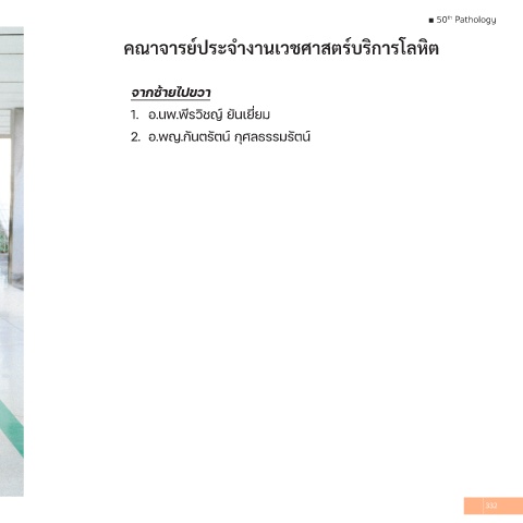 ■ 50 Pathology th ์ ำ ค์ณาจารย่ป็ระจางานเวชศาสำตร์บริการโล็หิต จากซ้้ายืไปขวา 1. อ.นพ.พีรวิชญ์ ยันเยี่ยม 2. อ.พญ.กันตรัตน์ กุศลธรรมรัตน์ 332